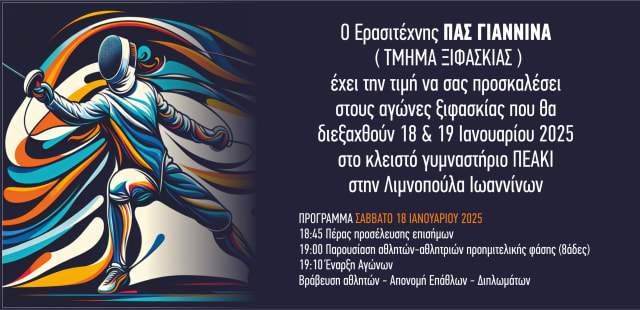 Περισσότεροι από 300 ξιφομάχοι από όλη την Ελλάδα αναμένεται να δώσουν το παρόν στους αγώνες ξιφασκίας που διοργανώνει ο ΠΑΣ ΓΙΑΝΝΙΝΑ το Σαββατοκύριακο 18 και 19 Ιανουαρίου 2025 στο κλειστό γυμναστήριο ΠΕΑΚΙ στην Λιμνοπούλα.